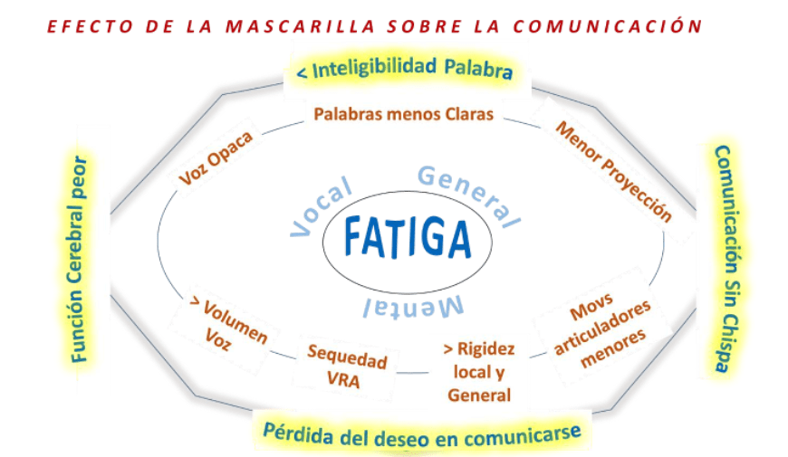 El resultado de esta situación puede ser la aparición, para los docentes, de gran fatiga vocal al final de la jornada laboral, y a los alumnos cansancio, porque el uso de la mascarilla provoca: