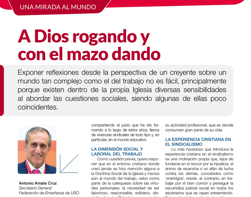 Antonio Amate, secretario general de FEUSO, ha publicado en el número 45 (abril-junio 2024) de la revista Trinidad y Liberación, la revista de los Trinitarios de España, un artículo titulado “A Dios rogando y con el mazo dando” en el que cuenta su trayectoria sindical dentro de la USO y describe el modelo sindical que defiende la Federación de Enseñanza, inspirado en el pensamiento socialcristiano.