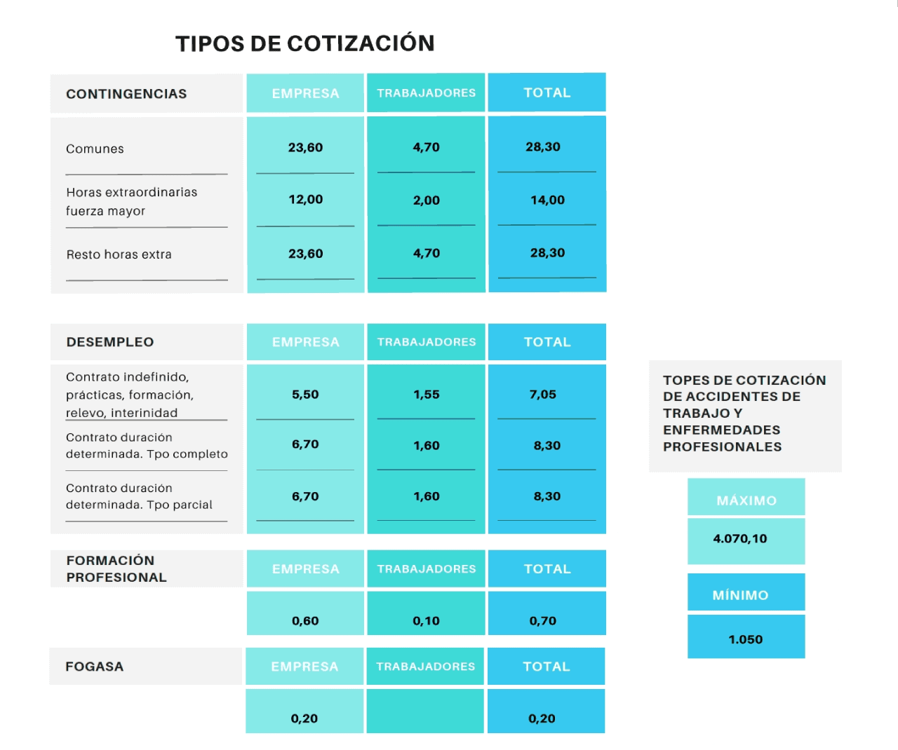 Sobre las contingencias comunes, el porcentaje es del 28,3 %, de los que el 23,6 % lo asume el empresario, y el trabajador cotiza solamente el 4,70% para poder recibir, cuando se dé el caso, las prestaciones por incapacidad temporal o permanente, la prestación por riesgo en el embarazo, por nacimiento de hijo o hija, por muerte y supervivencia (viudedad, orfandad), asistencia sanitaria y prestaciones farmacéuticas o la jubilación.